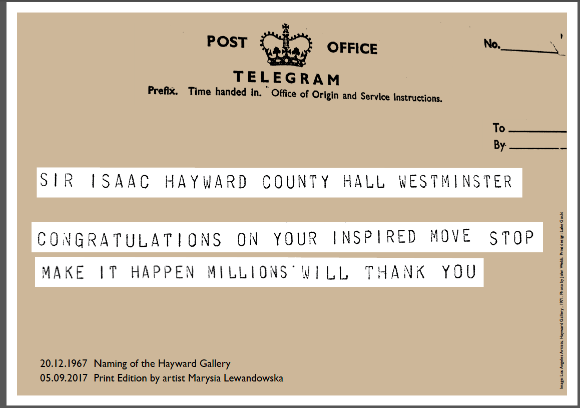 Millions Will Thank You celebrates a seminal moment in the Hayward Gallery’s history – the moment of its naming. In December 1967, just a few months before its official opening to the public in July 1968, the gallery was named in honour of Sir Isaac Hayward (1884-1976), the Leader of the London County Council, who has safeguarded the transformation of the South Bank into a site where public cultural institutions would thrive without commercial pressures.